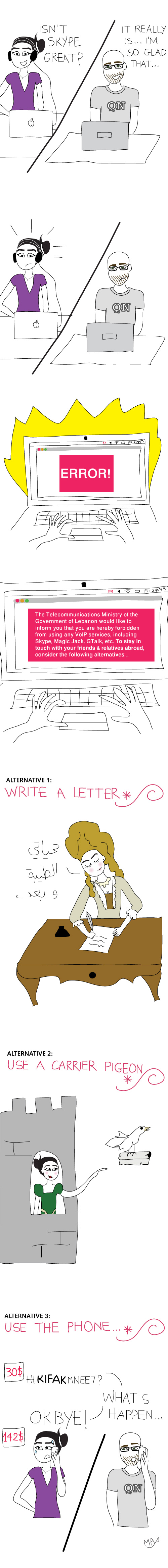 Here at Qifa Nabki, we’re wondering what all the fuss is about. Surely there are alternatives to Skype, no? Are we so addicted to the Internet that we’ve lost the capacity to communicate using other means? Click the image to the right to see what Maya Zankoul and I came up with…