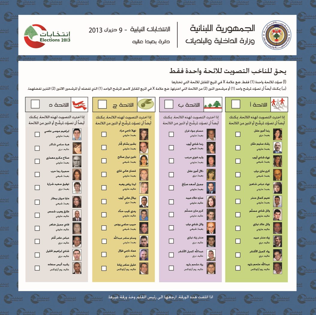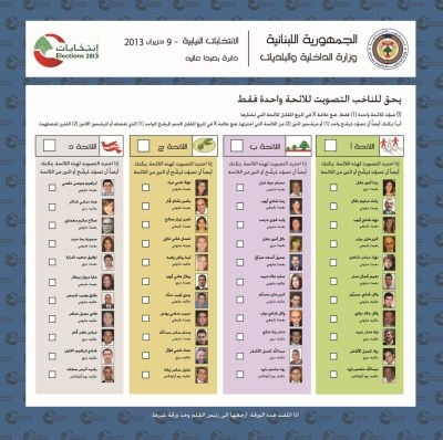 Lebanon’s Ministry of the Interior has commissioned the design of an official ballot that could be used in the 2013 election. Under this new system, it would be much more difficult for parties to track the ballots, which would then undermine the vote-buying economy in certain ways, although it is unlikely to collapse it entirely. (See above for a sample of the official ballot, and note that this is just one possible example of what it could look like).