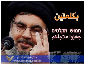 Update: Apparently, the hashtag “#جهزوا_ملاجئكم” (#PrepareYourShelters) has been trending on Twitter since yesterday. Hizbullah’s TV station, al-Manar, mocked up a graphic of the hashtag in Arabic and Hebrew.